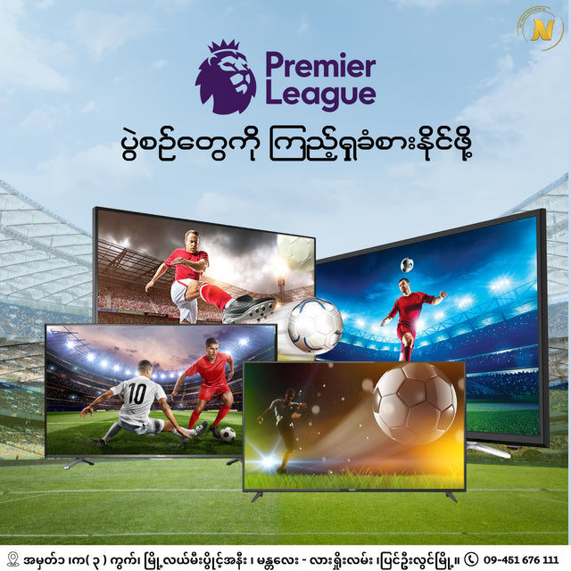 Premier League ပွဲ စဉ်တွေကို ...မလွတ်တန်းကြည့်ရှုခံစားနိုင်ဖို့ ...ကိုယ်တိုင် ဘောလုံးကွင်းထဲကို ရောက်ရှိပြီး ကြည့်ရှုနေသလို ခံစား ရရှိနိုင်မယ့် ....ကြည်တောက်ရှင်း ရုပ်ထွက် အသံတွေနဲ့ ....LG , Sony , Samsung , TCL အစရှိတဲ့ TV အမျိုးစားအစုံအလင်ကို ကြိုက်နှစ်သက်ရာ လက်မ အလိုက် စိတ်တိုင်း N-STAR Online Store နှင့် N-STAR အရောင်းဆိုင်များမှာ အာမခံ အပြည့်အ၀ဖြင့် ဝယ်ယူရရှိနိုင်ပြီဖြစ်ကြောင်း သတင်းကောင်းလေးပါးလိုက်ပါရစေ