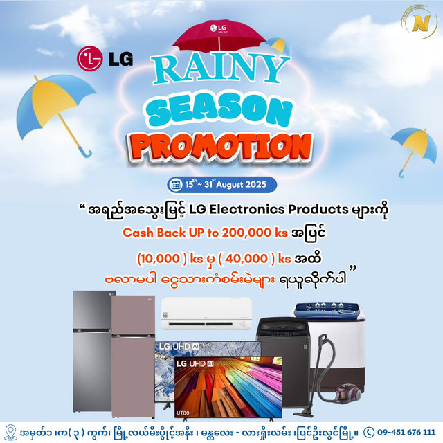 တန်ပြီးရင်းတန် တဲ့ LG Rainy Season Promotionတန်တန်နဲ့ မြန်မြန်ဝယ်ရမယ့်LG ရဲ့ Rainy Season Promotion ကြိီးမှာ ...LG တီဗွီ ၊ ရေခဲသေတ္တာ ၊ အဝတ်လျှော်စက် ၊ Aircon အပြင် တခြား အိမ်သုံး အီလက်ထရောနစ် ပစ္စည်းများကို သတ်မှတ်ထားတဲ့ မော်ဒန်အလိုက်ပြန်အမ်း ငွေ Cash Back Up To ( 200,000 ks ) အထိ လျှော့စျေးများ ရရှိနိုင်မယ့် အပြင် ..." ချက်ချင်း ဝယ် ချက်ချင်း ပေါက် ဗလာမပါ Lucky Draw " အစိီအစဉ်လေးလည်း ပါဝင်ဦးမှာ ဖြစ်ပါတယ် ...Lucky Draw Coupon တွင် 10,000 ks , 20,000 ks , 25,000 ks , 30,000 ks , 35,000 ks , 40,000 ks အထိ ကံထူးစမ်းခွင့် ရရှိနိုင်မှာ ဖြစ်တဲ့ အပြင် ...LG ရဲ့ ထီးလှလှလေးကိုပါ ထပ်ဆောင်း လက်ဆောင် ပေးသွားမှာ ဖြစ်တဲ့ အတွက် ..... တန်ပြီးရင်းတန်ပါပဲနော် ...ပရိုမိုးကာလ လေးတော့ ၂၀၂၅ ဩဂုတ်လ ( ၁၅ ) ရက်နေ့ မှ ( ၃၁ ) ရက်နေ့ အထိသာ ရောင်းချပေးမှာ ဖြစ်လို့ ...LG Products များ ဝယ်ယူမယ်ဆို N-STAR မှာ လက်မနှေးပဲ အမြန်လာရောက်ဝယ်ယူထားလိုက်ဖို့ သတင်းကောင်းလေးပါးလိုက်ပါရစေ....